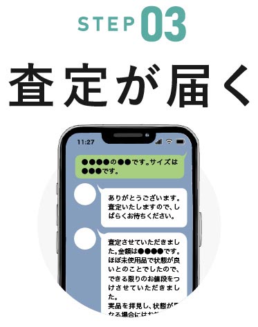 スタッフがその場で査定・見積もりを行います。査定金額にご納得いただけましたら、買取成立となります。査定金額にご納得いただけない場合はお取引のキャンセルも可能です。